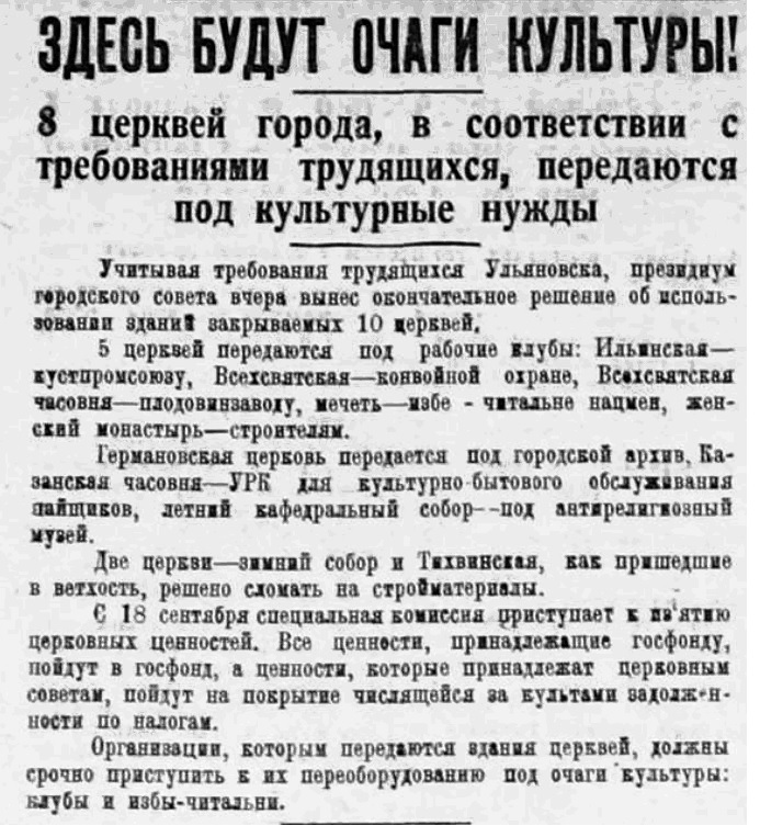 Учитывал требования трудящихся Ульяновска, президиум городского совета вчера вынес окончательное решение об использовании зданий закрываемых 10 церквей. 5 церквей передаются под рабочие клубы: Ильинская — Кустпромсоюзу, Всехсвятская — конвойной охране, Всехсвятская часовня — плодовинзаводу, мечеть — избе-читальне, женский монастырь — строителям.