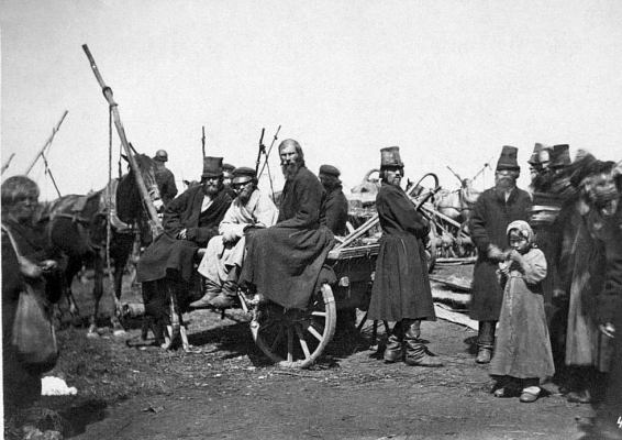 Бедняки в Симбирской губернии. На мальчике-подростке сума для подаяний: