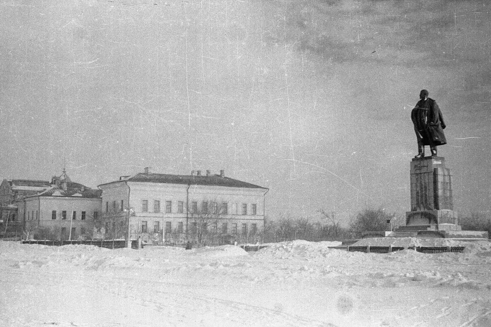 На заднем плане – здание Ульяновского государственного аграрного университета им. Столыпина (тогда - Ульяновский сельскохозяйственный институт). Виднеется купол здания Краеведческого и Художественного музеев.