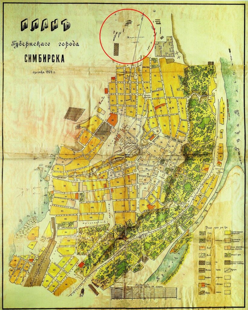 (на фото - План губернского города Симбирска. 1904-1905 гг. ГАУО. На плане красным кружком выделен район Кирпичных сараев, находившийся за чертой города. Источник фото - https://vk.com/wall-107791040_2413)