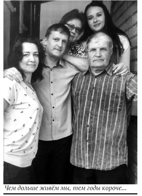 Рядом с ней стоят дочь Елена, сын Алексей, сноха Дарья, муж. На этом же снимке, вновь написаны ею слова: «Чем дольше живём мы, тем годы короче». А с любимыми внуками Денисом, Настей и Димой она много раз фотографировалась раньше. Как и со своими коллегами и выпускниками.
