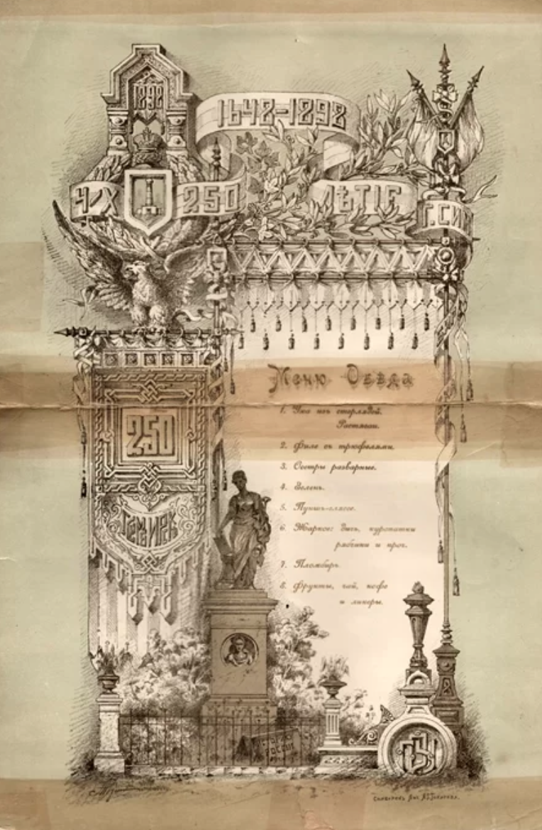 Праздничный обед в честь 250-летия Симбирска был дан в зале Дворянского собрания 4 октября 1898 года. Меню трапезы, к слову, удивляет и содержанием, и оформлением. Над визуальной составляющей трудился архитектор Н. И. Розетти. Талантливый мастер прекрасно оформил меню и впервые изобразил в качестве символа Симбирска памятник Н.М. Карамзину.