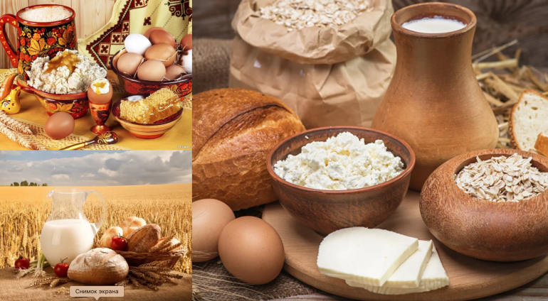 Из молочных продуктов готовили большое количество блюд. Молоко употребляли в сыром, кислом и топлёном виде, делали творог, сметану и масло. В посты молочные продукты заготавливали впрок, хранили в погребах, холодных сенях. Яйца употребляли в варёном и печёном виде.