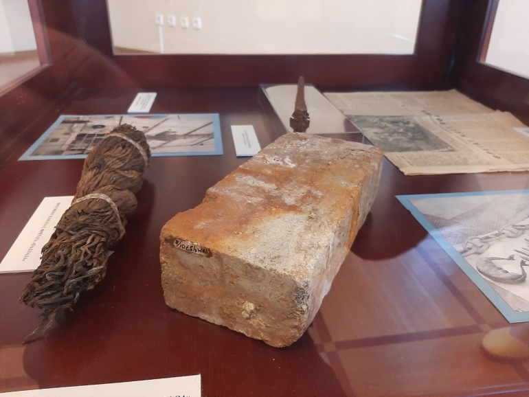 Это огнеупорный кирпич из обожённой глины с шотландским клеймом. Он был поднят с фрегата «Паллада» в гавани Советской в бухте Постовой и перевезён сотрудниками музея в Ульяновск.