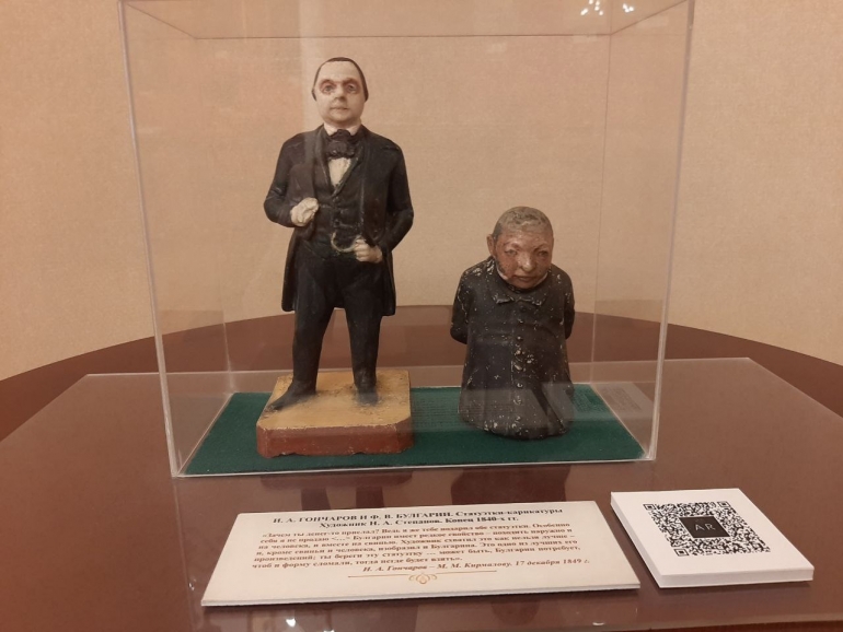 Была и третья фигурка, тоже Гончарова. Её он отправил своему брату в Симбирск. Его племянник потом вспоминал, что как-то к ним в гости пришёл поэт Минаев и пририсовал к этой фигурке бороду. Эта фигурка до нас не дошла. А сестра подарки брата сохранила, и её дочь в 1901 году передала эти фигурки в Симбирск для музея Гончарова. Правда, нижняя часть фигурки Булгарина — ноги и подиум — не уцелела.