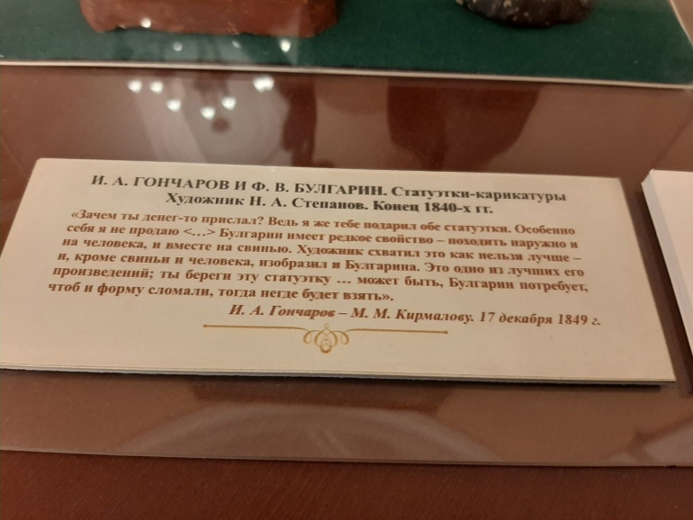Интересно, что отношения у Гончарова с Булгариным были не очень хорошие. Собственно, у Булгарина мало с кем из литераторов его времени были хорошие отношения, он дружил только с Александром Грибоедовым. Зачем же Гончаров купил его фигурку? В письме к сестре он объясняет, что художник верно схватил умение Булгарина походить одновременно на человека и на свинью.