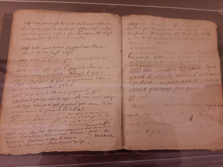 Потом летописец вёл отец Гончарова и сделал своей рукой запись о рождении будущего писателя — летописец сейчас открыт на этой странице. «1812 года июня 6 дня родился сын Иван. А именник июня 24 дня». Последнюю запись сделал племянник писателя по линии матери в 1889 году. Видимо, тогда мода на семейные хронографы окончательно прошла. В 1901 году документ передали в Симбирск для музея писателя.