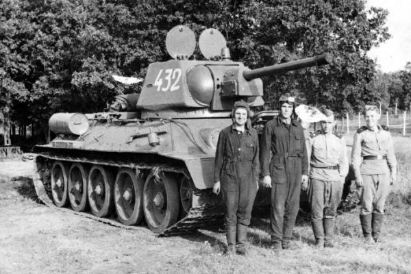 Курсанты-гвардейцы рядом с учебным Т-34: