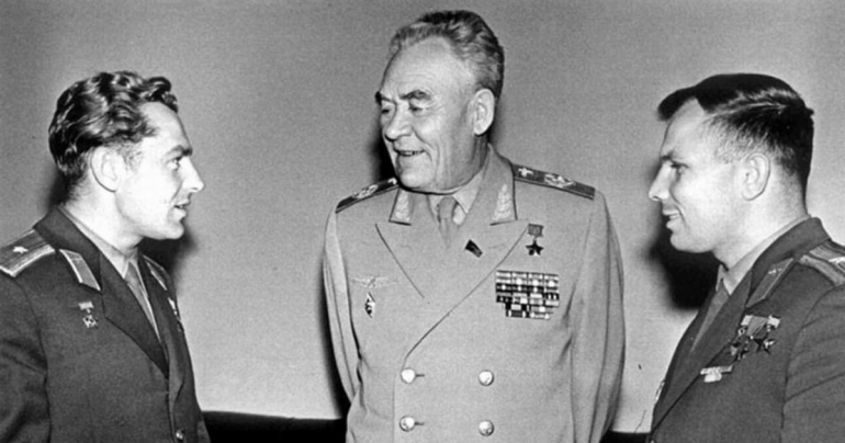 Главный маршал авиации Константин Вершинин, здесь он в компании с первыми космонавтами Гагариным и Титовым, самый именитый выпускник и сотрудник Ульяновского училища:
