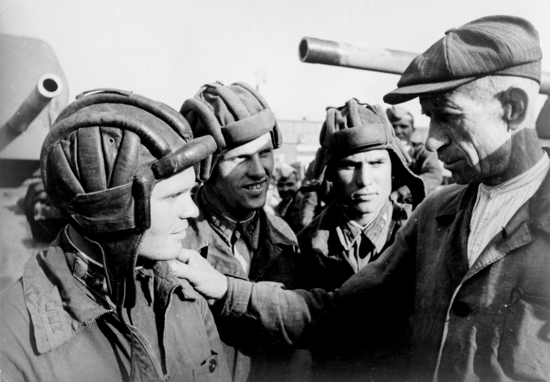 Герой Советского Союза Владимир Хазов, крайний слева, со своими танкистами и пожилым ветераном Гражданской войны, лето 1942 года: