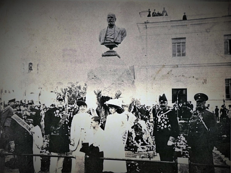 На открытии памятника П. Столыпину в Симбирске, 1913 год. Полицмейстер Пифиев – крайний справа, губернатор Ключарев – второй слева, вдова и дети – в центре: