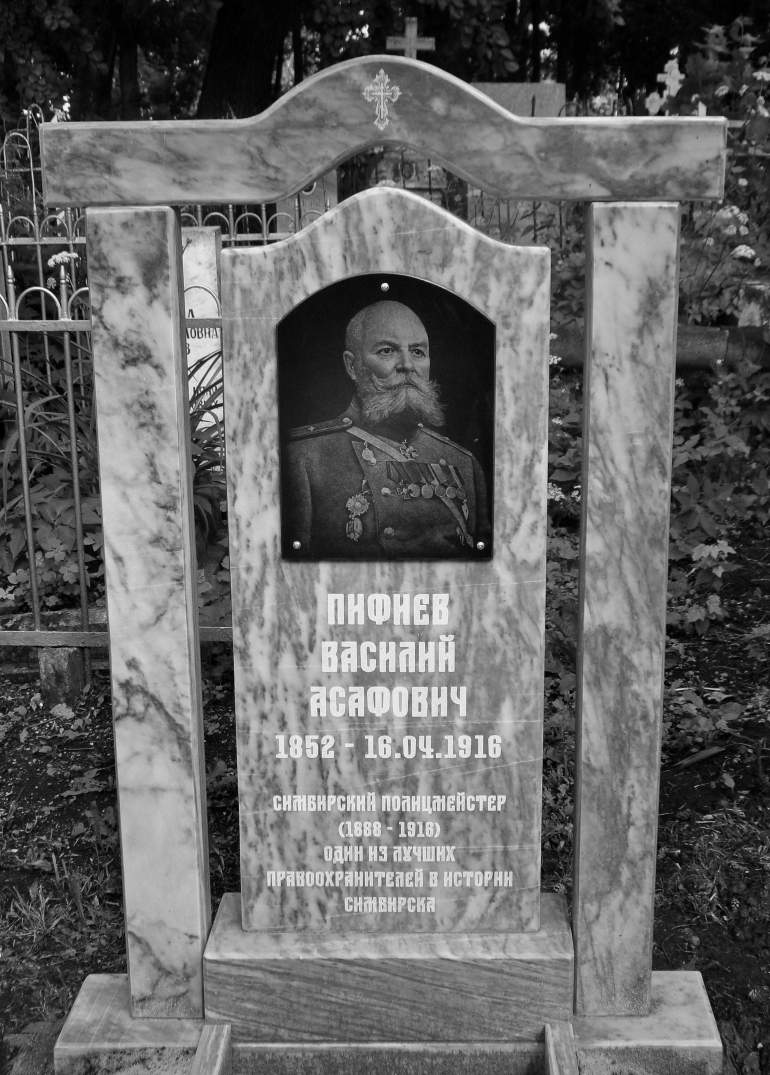 Минуло четверть века стой поры, когда мы с добрым другом и коллегой, нашим именитым краеведом Антоном Юрьевичем Шабалкиным стали посещать в просветительских целях Воскресенский некрополь, Старое городское кладбище на улице Карла Маркса. Уже с первых походов нас заинтересовали – не могли не заинтересовать, поскольку прямо бросались в глаза – массивные дореволюционные надгробия в непосредственной близости от Воскресенского храма: Елизавета Ивановна Пифиева и Виктор Васильевич Пифиев, корнет 5-го Уланского Литовского Его Величества Короля Виктора Эммануила III полка. Они – ближайшие родственники, жена и сын Симбирского полицмейстера Василия Асафовича Пифиева.