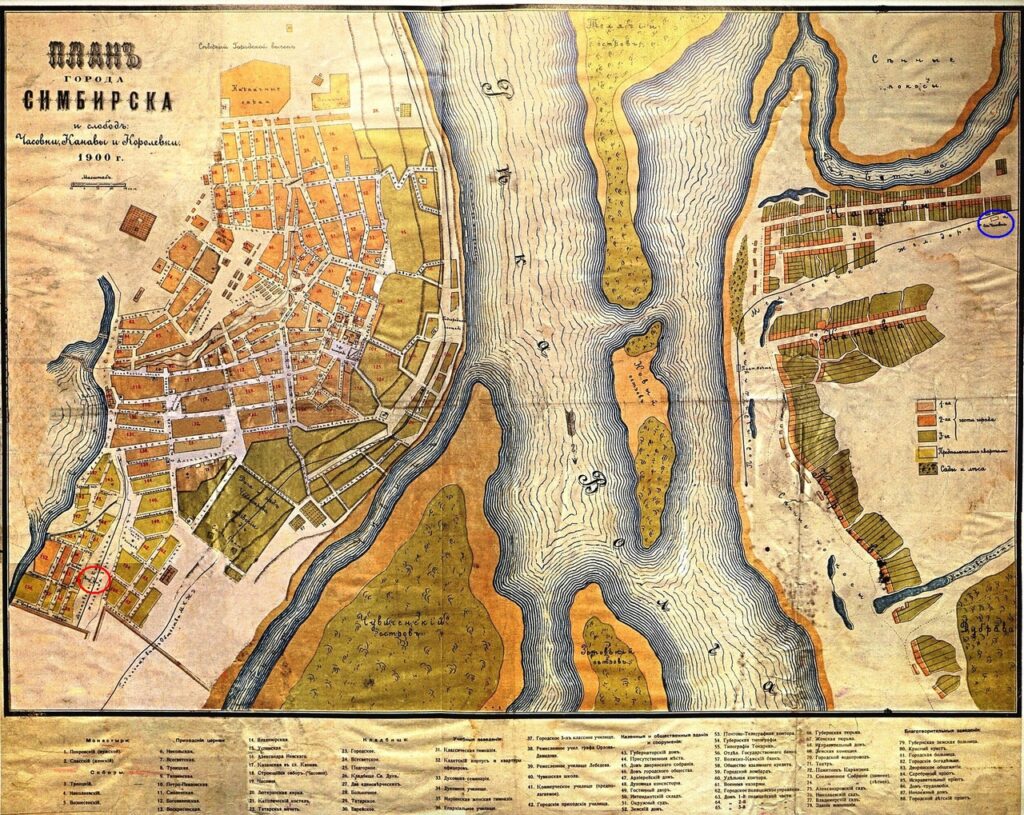 План Симбирска до строительства моста через Волгу. На левом берегу - слободы Часовня, Канава и Королёвка. 1900 год: