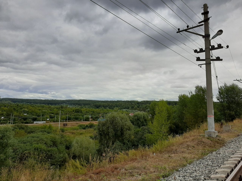 Вид с насыпи железной дороги на Майскую гору. За столетие ландшафт сильно изменился, русло Карасёвки (её за зеленью не видно) прочистили и расширили, а болота осушили: