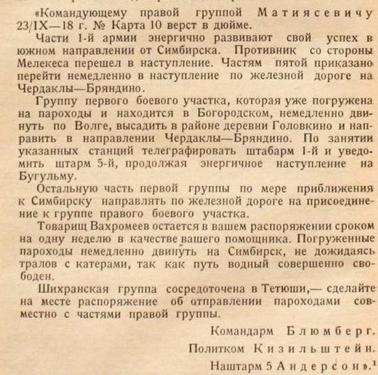 А Тухачевский продолжал заваливать Вацетиса телеграммами. 21 сентября: “Настойчиво прошу Вас посадить правобережную Вашу группу на пароходы и экстренно доставить её в Симбирск”. 22 сентября: “Прошу энергично воздействовать вас на пятую армию и перебросить их силы на пароходах в Симбирск”.