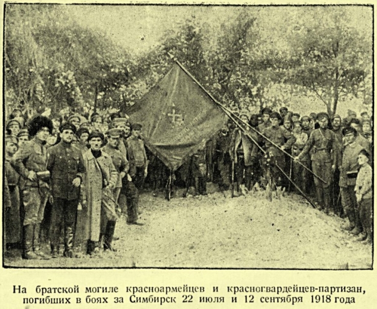 Как ведётся в России, из столиц революционная «мода» распространилась в провинцию. События 1917 года обошлись в Симбирске без массовых кровопролитий. Первыми воистину «революционными» похоронами стало погребение бойцов Народной армии, освободившей Симбирск от большевиков 22 июля 1918 года — да, мы некорректно, по привычке, зовём их белогвардейцами. А ведь по декларируемым политическим предпочтениям они были социалистами-революционерами, поклонялись не Богу, а Марксу, ратовали за отмену частной собственности и сражались под красными флагами, только с надписью «Вся власть Учредительному собранию!».