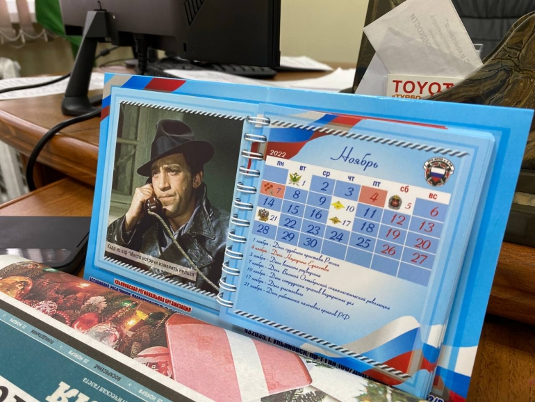 Рабочий кабинет не пестрил какими-то особыми атрибутами, все лаконично. На рабочем столе — кипа бумаг, коллективное фото с близкими и коллегами, откидной календарик с Глебом Жегловым — главным героем милицейского детектива «Место встречи изменить нельзя». В шкафу за стеклом — книга к юбилею прокуратуры и издание про Минюст.