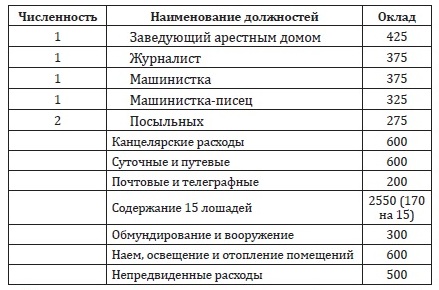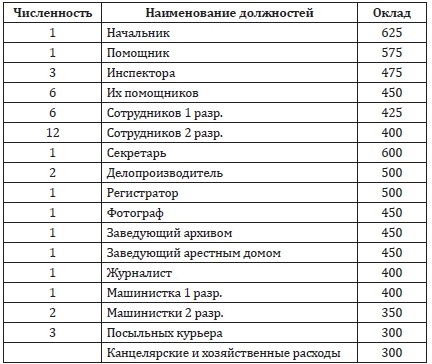 На основании полученных рекомендаций и с учётом местных возможностей уже губернским отделом управления вместе с управлением губмилиции были разработаны штаты и оклады симбирской уездной милиции в следующем виде (ГАУО. Ф. Р-200. Оп. 2. Д. 11. Л. 15).