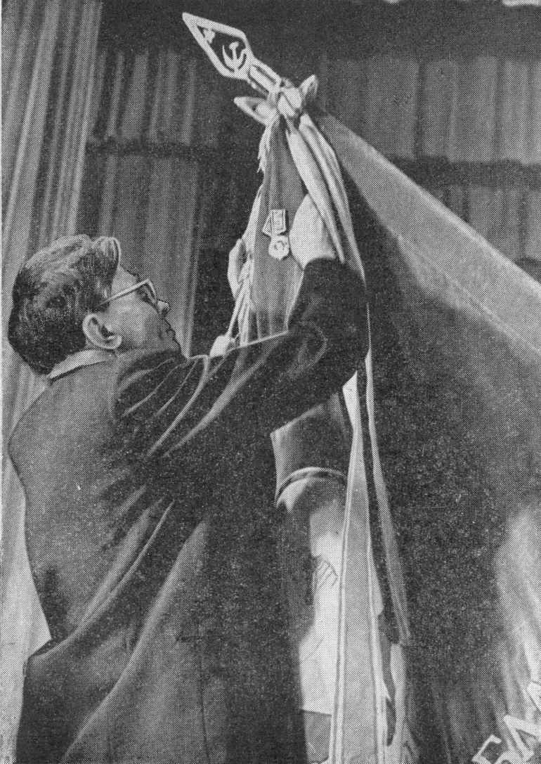 Михаил Суслов прикалывает Орден Ленина к знамени Ульяновской области: