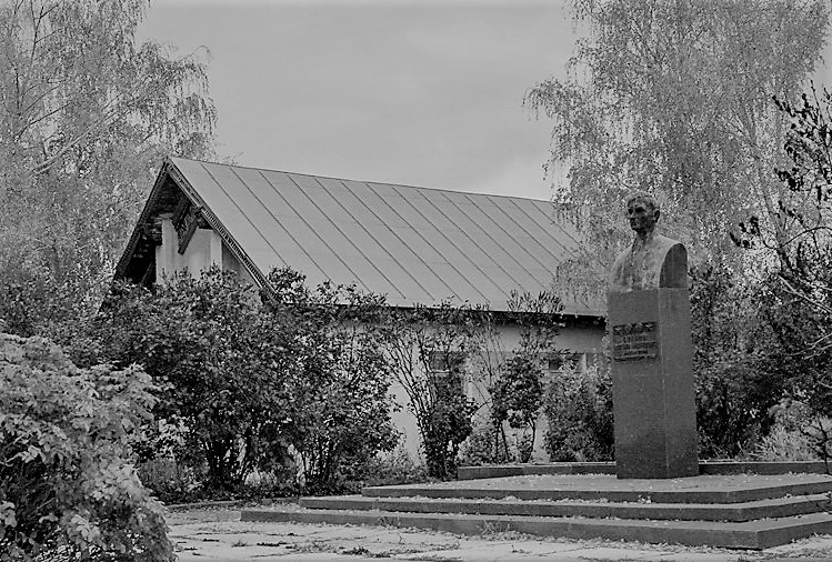Бюст Михаила Суслова на фоне библиотеки-музея в селе Шаховское:
