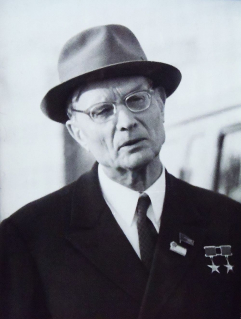 Михаил Андреевич Суслов в Ульяновске. Под флажком депутата Верховного Совета СССР виден значок ульяновской школы № 1: