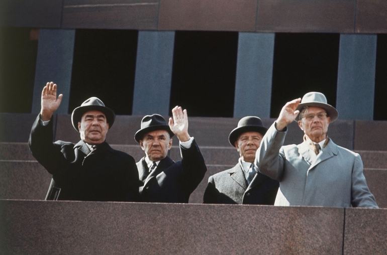 Брежнев, крайний слева, и Суслов, крайний справа, на трибуне Мавзолея: