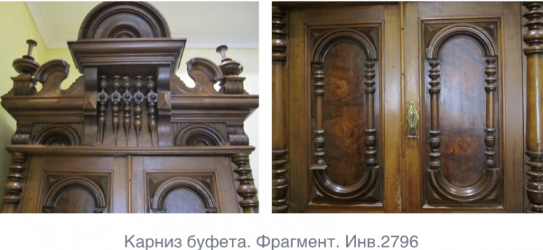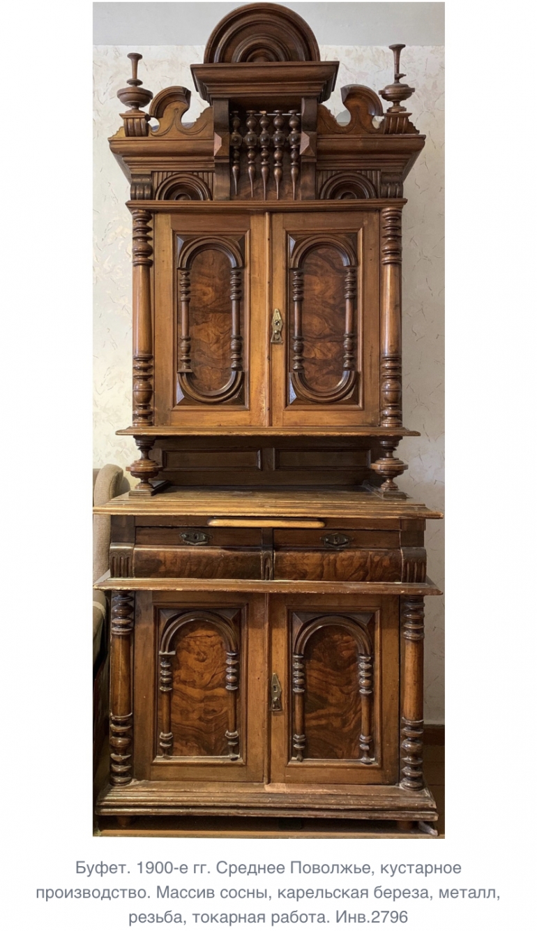 Мебель делали также на многочисленных мелких кустарных предприятиях. Множество земских мастерских работали по всей России, в том числе и на Средней Волге. Их продукция отличалась бóльшей простотой, особенно в декоре. Чаще декор состоял из всевозможных точеных деталей и целых композиций из них, ограничивался несложной резьбой, меньше уделялось внимание внутреннему оформлению, что мы и наблюдаем на примере нашего буфета.