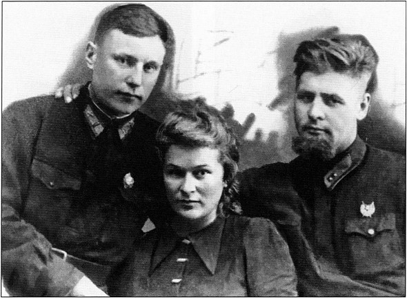 Вадим Фадеев, справа, с другом Александром Покрышкиным и его женой Марией. Начало 1943 года: