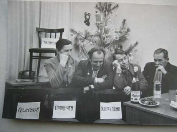 В ожидании Нового года — Антончик, Егоров, Тельнов, Архангельский. Табличками обозначены имена отсутствующих коллег: