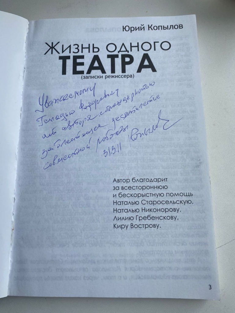 В 1993 году меня назначили директором областного драматического театра. Считаю, что работал там в его лучшие годы, так как главным режиссером был Юрий Копылов. Это был гений, мы с ним очень хорошо ладили. Я, как любой директор, обеспечивал все его творческие идеи. И это было прекрасное взаимодействие. Спасибо ему! На своей книге «Жизнь одного театра» он написал мне добрые слова: «Уважаемому Геннадию Федоровичу от автора с благодарностью за блестящее десятилетие совместной работы. 31.03.2011». Я этой записью очень дорожу.