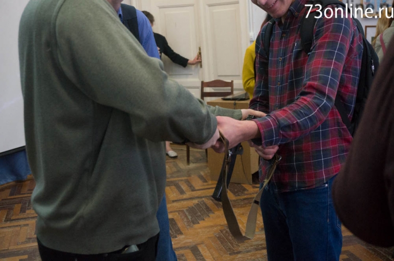 Об экспонатах посетителям без устали рассказывал сам Олег Вагин как владелец коллекции, он же показывал, как держать оружие, как нажимать на курок, как взводить затвор. Организованные группы студентов сменяют одна другую; подержать в руках винтовку, револьвер, примерить каску интересно и девушкам, и парням.