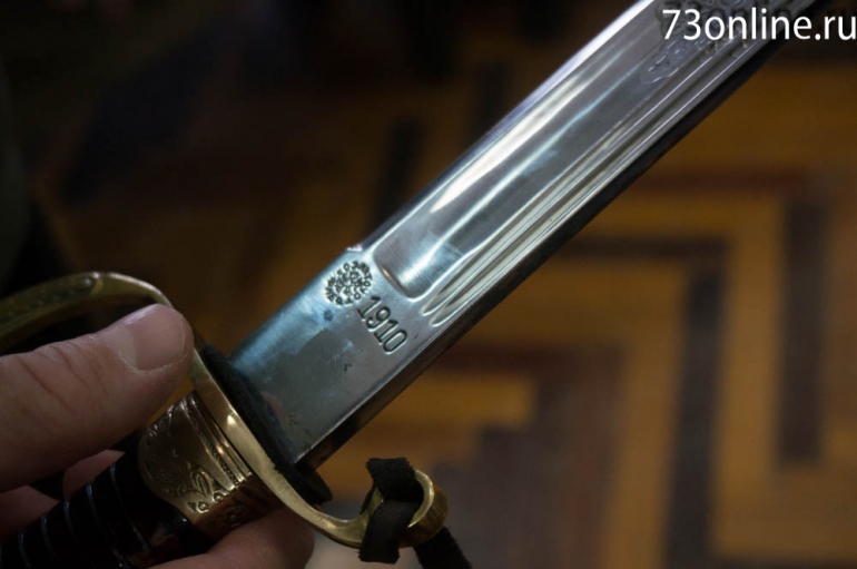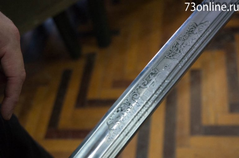 Интересующимся Вагин демонстрирует приемы фехтования саблей: наносит удары по воздуху сверху вниз, крест-накрест.