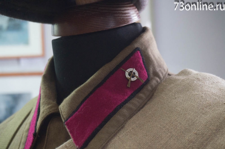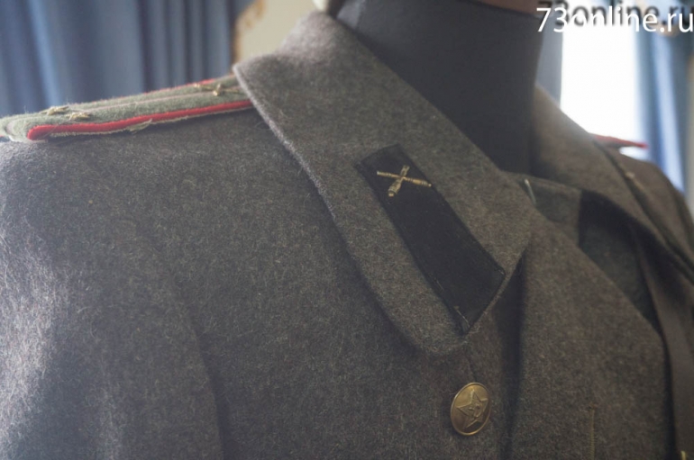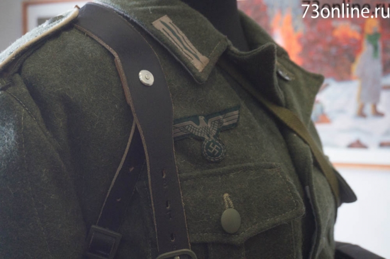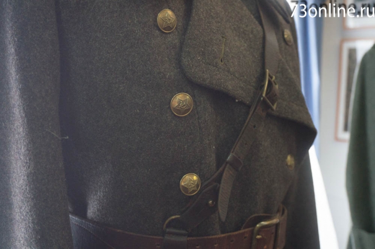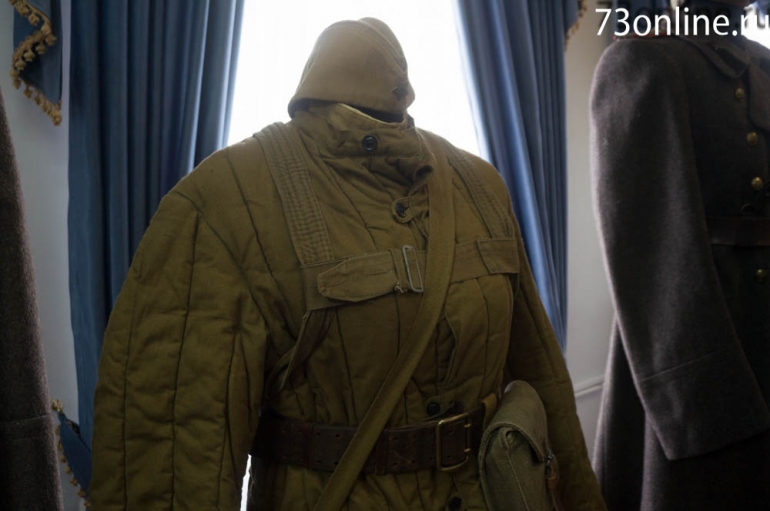 Рассказывает о военной форме: на выставке представлены оригинальные предметы экипировки — шинель 1943 года, форма 1935-го, первая русская каска.