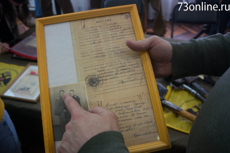 Из семейного архива Вагин представил много документов и фотографий деда — Николая Гавриловича Разуваева — времен войны. В 1945 году он был ранен, уже в Германии, и рукописная справка из госпиталя написана на трофейной бумаге: с обратной стороны стоит немецкая сигнатура. Поправившись, Разуваев снова участвовал в боях, получил грамоту за взятие Берлина. Все семейные реликвии Вагин бережно хранит, показывает сыну.
