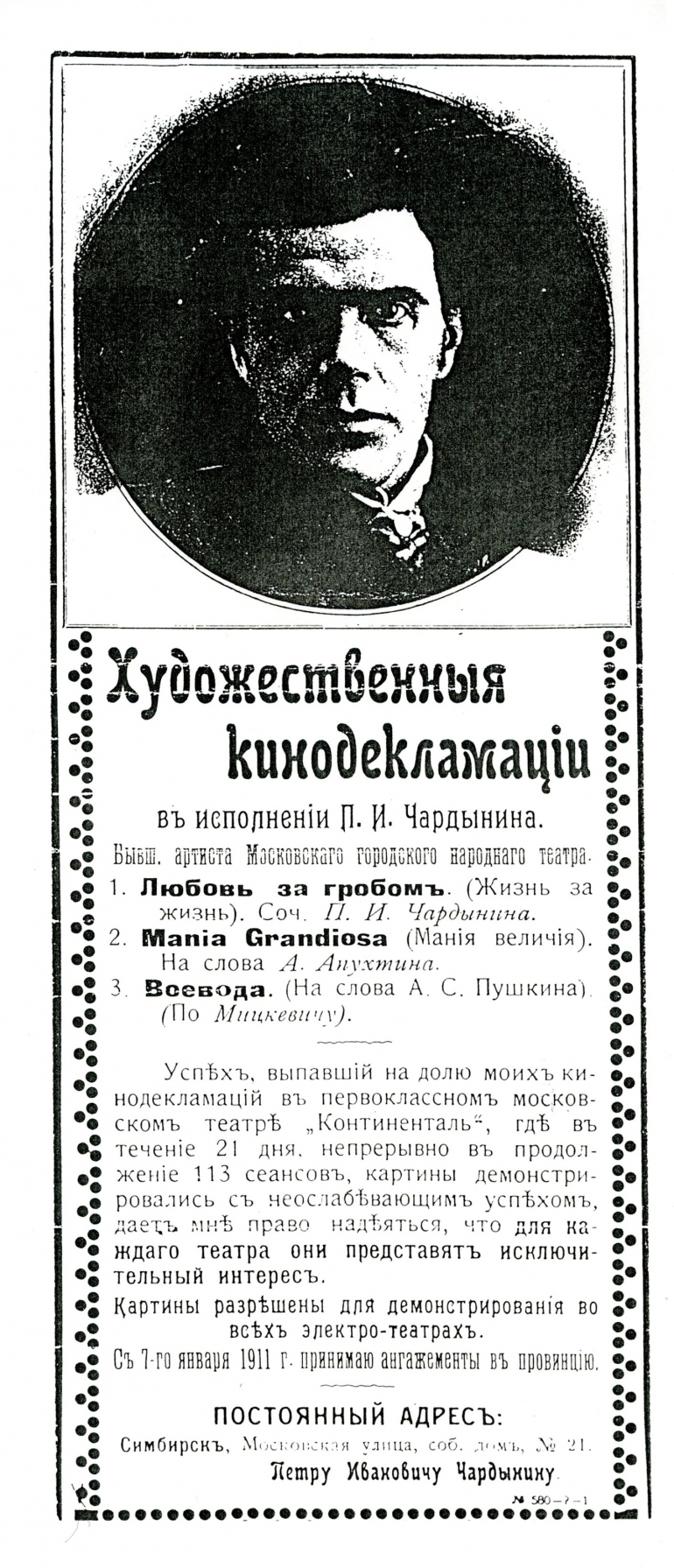 Рекламная листовка П. Чардынина с указанием постоянного адреса проживания в Симбирске на Москвоской улице: