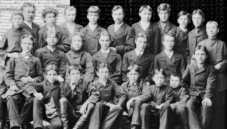 Петр Красавцев, третий слева в третьем ряду, среди одноклассников. В центре в том же ряду стоит его классный рководитель С. Рогозин: