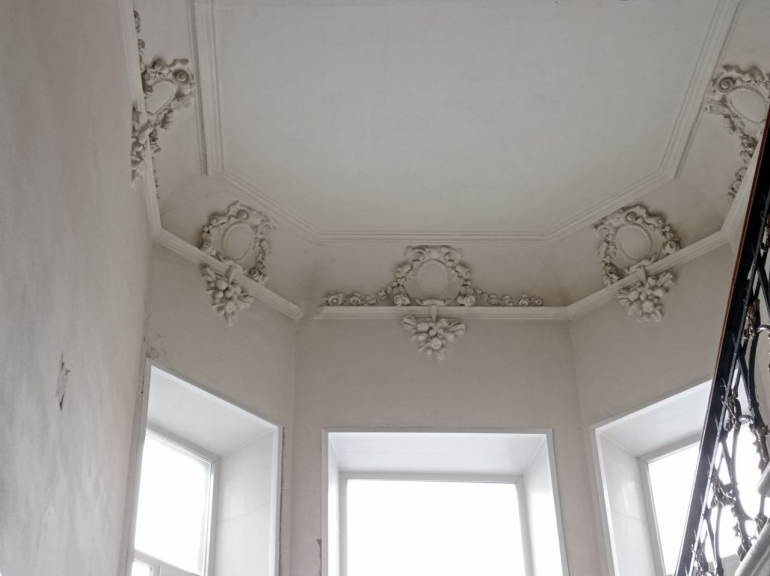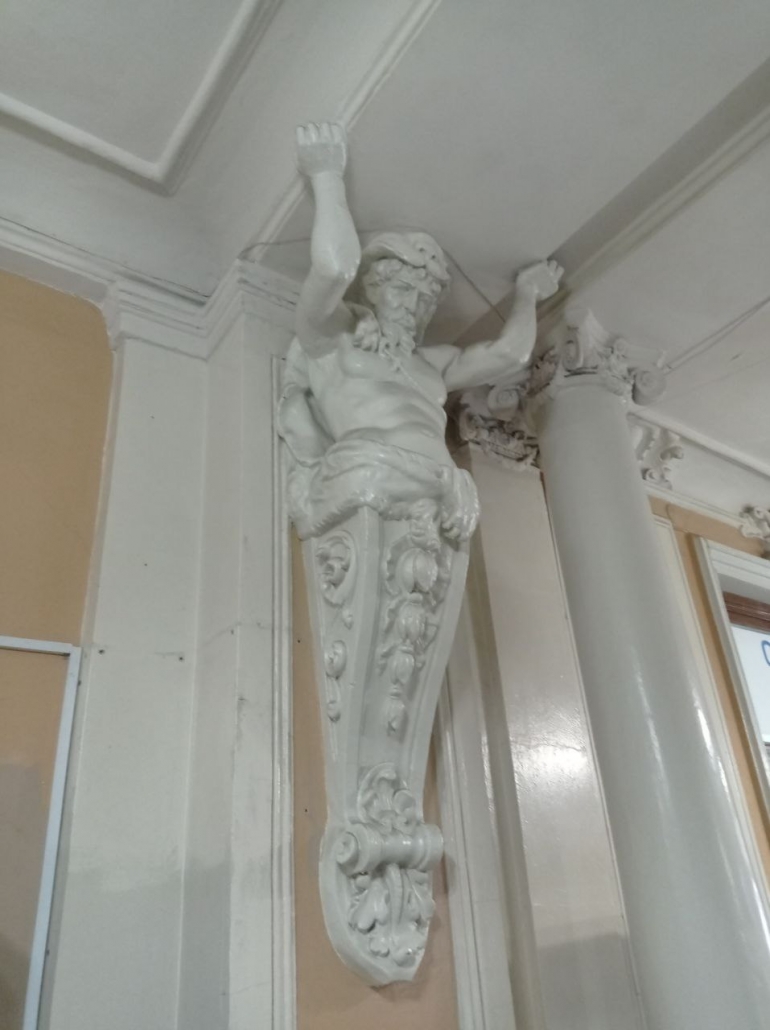 В холле первого этажа можно увидеть атлантов, которые держат уже не такой белоснежный потолок, как в помещениях. Фигуры и барельефы, хотя и не сверкают, как в первый день, нигде не откололись и не треснули.