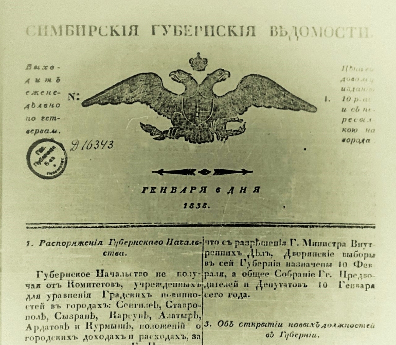 6 (19) января 1838 года вышел в свет первый выпуск газеты «Симбирские губернские ведомости», первенец симбирской прессы.