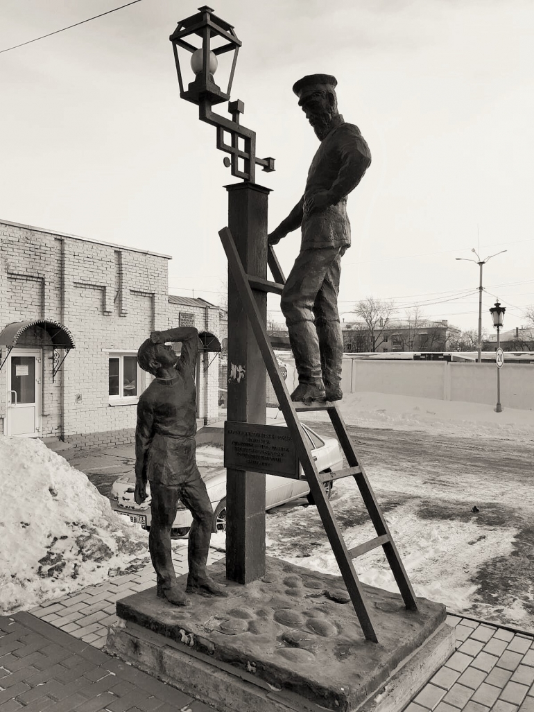 Скульптурная группа «Первый электрический фонарь» рядом со зданием электростанции: