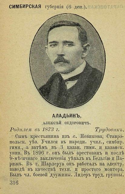 Параллельно, в ущерб учёбе, студент Аладьин занялся революционной агитацией и пропагандой среди рабочих и крестьян в казанских предместьях. Всё закончилось печально: в 1896 году 23-летний Алексей был арестован и на девять месяцев попал в Казанскую пересыльную тюрьму, где успел отметиться Ульянов-Ленин.