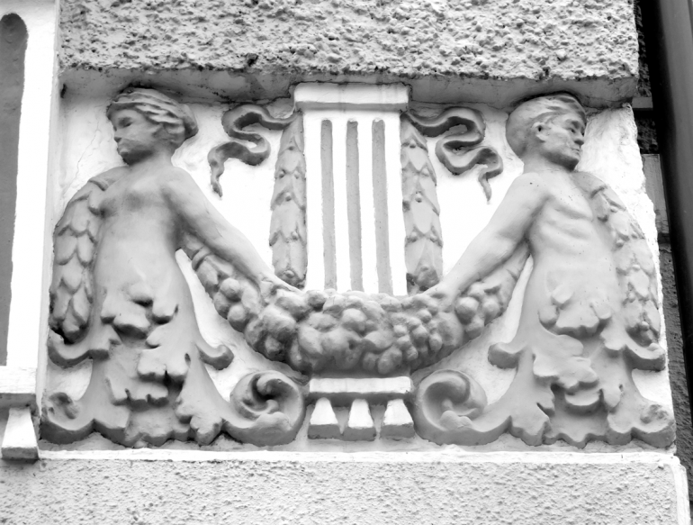 На фасаде здания появились несколько неожиданные сюжеты из древнегреческой мифологии: парные изображения злобных морских божеств - бога бури Форкия и его жены богини морской пучины Кето, чьё имя, собственно, и означало «морское чудовище»: от него произошло слово «кит». Форкий и Кето могли подавать богатство и удачу, но «дружить» с ними, всё равно, как заключать сделку с дьяволом, то есть, чревато опасностями и обманом, и выстоять в этом симбиозе были способны только особо подготовленные колдуны и маги.