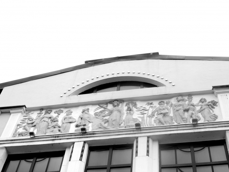 Ещё более любопытен обширный фриз на фасаде, в центре которого древнегреческая богиня Деметра - Мать-Сыра Земля славянских сказаний, порождающая всё живое и принимающая в себя всё умершее. Богиню окружают персонажи её свиты, боги и богини рангом поменьше.