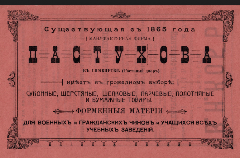 Реклама мануфактурной фирмы Петра Пастухова в Симбирске: