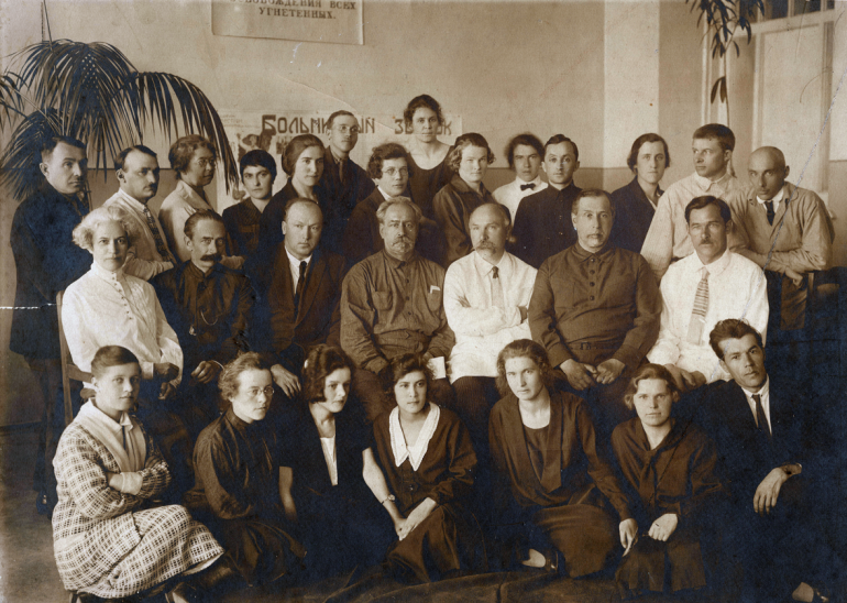 Доктор Емельянов, третий слева во втором ряду, среди персонала Ульяновской межрайонной больницы. Начало 1930-х годов: