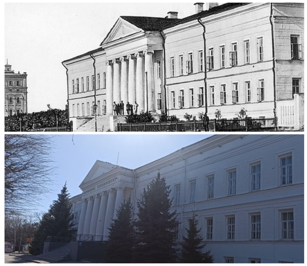 – На фотографии – здание Губернских присутственных мест, построенное к 1807 году. Это образцовый проект известного в России зодчего Андрияна Дмитриевича Захарова (он, кстати, автор здания Адмиралтейства в Санкт-Петербурге).В архитектурном ансамбле Симбирска именно здание Губернских присутственных мест стало первым, выполненным в стиле классицизма. Позже появились возведенные по классическим канонам Свято-Троицкий собор и здание Дворянского собрания. Здание губернских присутственных мест стало формировать парадный фасад верхней волжской набережной. Оно торжественное, строгое, в стиле русского классицизма: 6 колонный портик, высокая широкая лестница… В 1940 году здание было передано Сельскохозяйственному институту, – отмечает Юлия Кириллова.