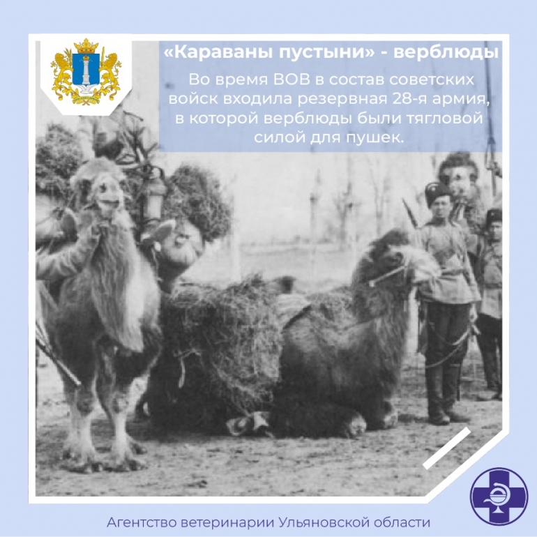 Во время ВОВ в состав советских войск входила резервная 28-я армия, в которой верблюды были тягловой силой для пушек. Она была сформирована во время Сталинградской битвы в Астрахани. Из-за нехватки лошадей стали приручать около 350 диких верблюдов. Большинство из них погибли в разных сражениях, а тех, которые выжили, постепенно «демобилизовали» в зоопарки.