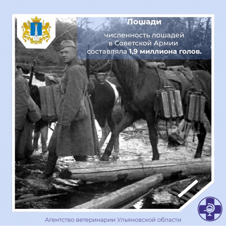 Несмотря на то, что Вторую Мировую называют войной моторов, лошади сыграли далеко не последнюю роль в битвах. Только по официальным данным численность лошадей в Советской Армии составляла 1,9 миллиона голов. Лошадей применяли как транспортную силу, особенно в артиллерии. Упряжка в шесть лошадей тянула пушку. Обозы с продовольствием и полевые кухни доставляли на позиции именно лошади. Несмотря на то, что лошадь не могла преодолеть больше 100 км за сутки, но она могла пройти там, где не проедет никакая техника, и причем сделать это незаметно. Поэтому часто лошадей использовали для стремительных рейдов по тылам противника. Большинство лазаретов были на «конной тяге». Точных данных о том, сколько лошадей погибло за войну нет. Но считается, что во Время Великой Отечественной Войны Советская Армия потеряла больше миллиона верных коней.