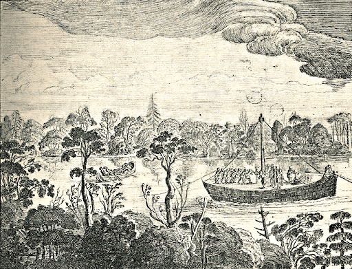 Струг на Волге, гравюра Адама Олеария. Он был не только дипломатом, писателем и картографом, но и неплохим художником: