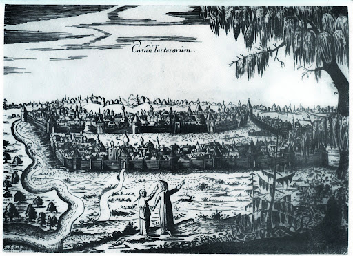Вскоре поднялся ветер и путешествие немного ускорилось. Олеарий описывает, что все встреченные ими поселения располагались на правом берегу и были скорее крепостями, чем деревнями или городами. Это и понятно - на левом берегу лежало Дикое поле, мир кочевников, от набегов которых крепости на Волге защищали мир земледельцев.