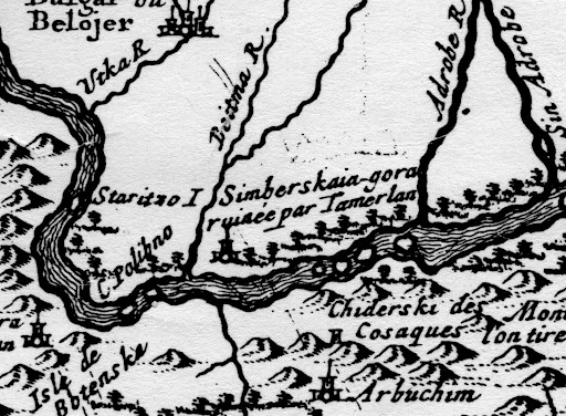 21 августа Адам Олерарий записывает в своём дневнике: “”Мы оставили за собой, с правой от нас стороны, два прекрасных на вид места, на которых некогда стояли города, и дальнейший из них назывался Симбирская Гора. Этот город разрушен был Тамерланом”.